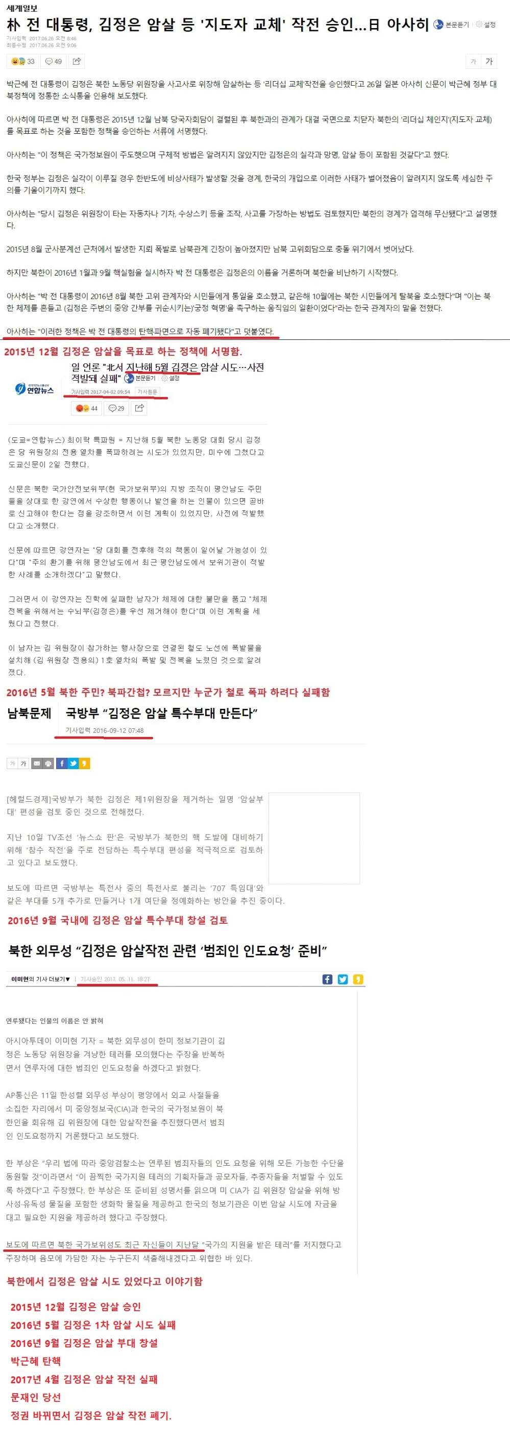 朝日新聞は26日、韓国の対北朝鮮政策に詳しい関係筋の話として、「朴槿恵(パククネ)前政権が2015年末以降、北朝鮮の金正恩(キムジョンウン)・朝鮮労働党委員長を指導者の地位から追い落とす工作を行おうとした」と報じた。「正恩氏の暗殺も選択肢とした政策だった」という。