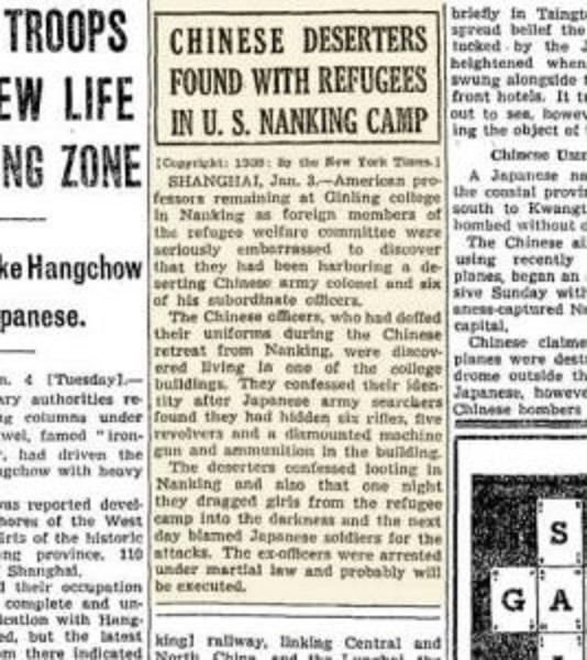 南京安全区のメンバーとして南京金陵大学に留まっていたアメリカ人大学教授は、彼らが匿っていた元中国軍大佐とその6人の部下が発見されたことを知らされ、非常に困惑した。教授らはこの大佐を難民区における実質上二番目の権力者にすえていた。南京戦からの退却の際、軍服を脱ぎ捨てていた将校らは、その後、大学のなかに潜んでいたのを発見された。日本軍に発見された後、その身分を明かした彼らは6挺のライフル銃、5挺のリボルバー式拳銃、それと分解したマシンガンと弾薬を建物内に隠し持っていた。アメリカ人および他の外国人の前で告白したところによると、将校らは市内で略奪を働いていたという。またある夜などは少女を暗がりに連れ込んだこともあったという。そればかりでなく、翌日それが日本兵の仕業だったと周囲に吹聴したことも白状した。逮捕された将校らは日本軍の軍律に基づき裁かれるだろう。おそらく処刑されるはずだ。