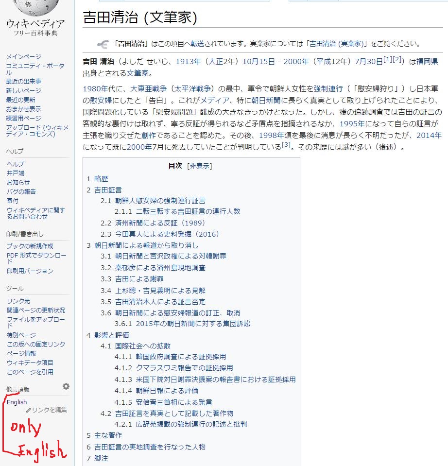 そうすると、なんと、ウィキペディアで「吉田清治」を調べると、日本語と英語でしか書かれていなかった。