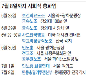 절정은 30일 서울 광화문광장에서 농민·학생 등도 참여하는 3만~4만명 규모 '상경 투쟁'이다. 민노총 산하 단체 16곳은 사회적 총파업 당일인 30일 정오부터 서울 도심 각지에서 사전 집회를 연 뒤 오후 3시부터 서울 광화문광장에서 열리는 본대회에 합류할 예정이다. 경찰 관계자는 "평일인 금요일 오후 수만명이 서울 도심에서 행진을 벌인다면 교통 대란이 불가피할 것"이라고 했다.