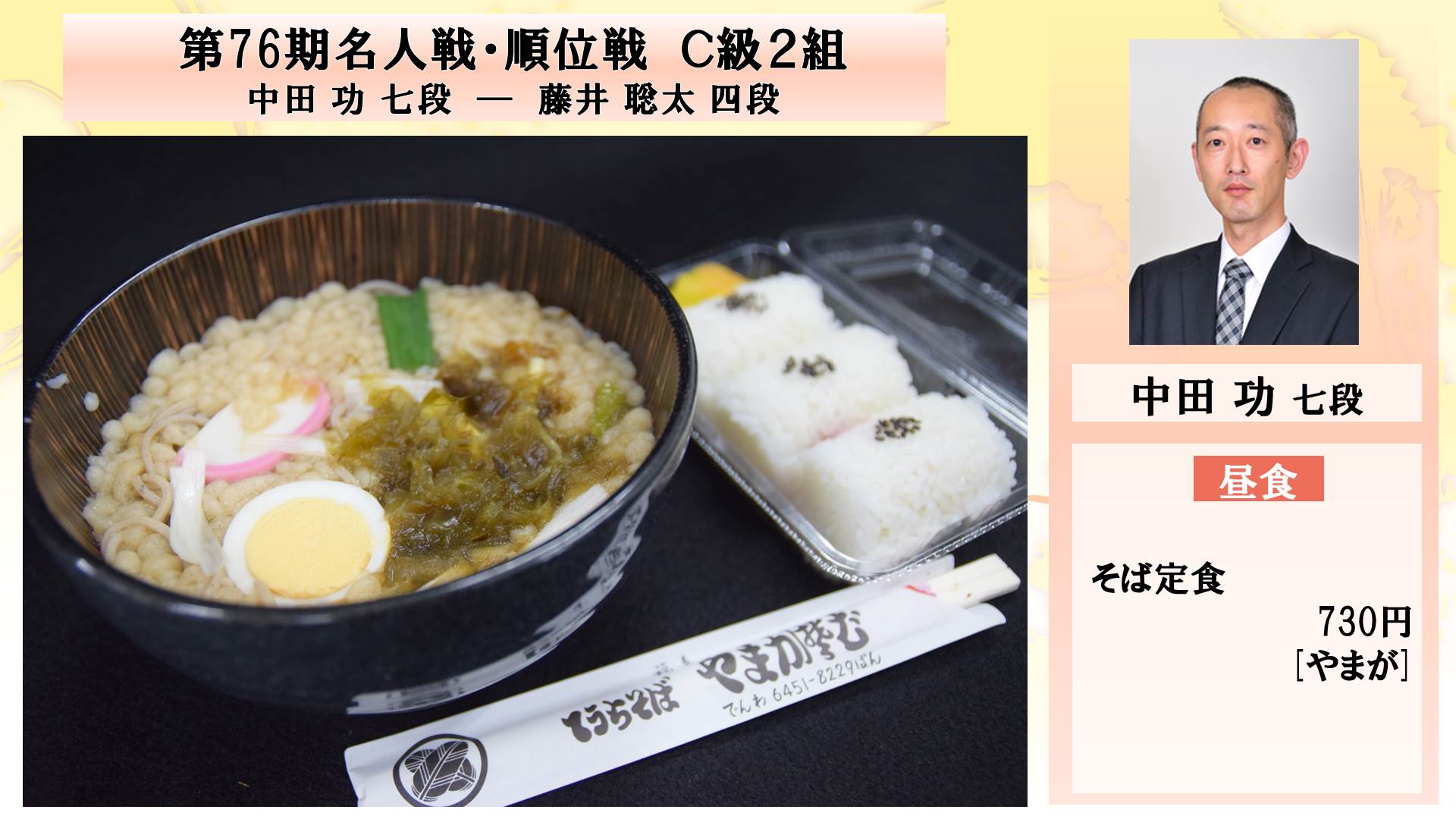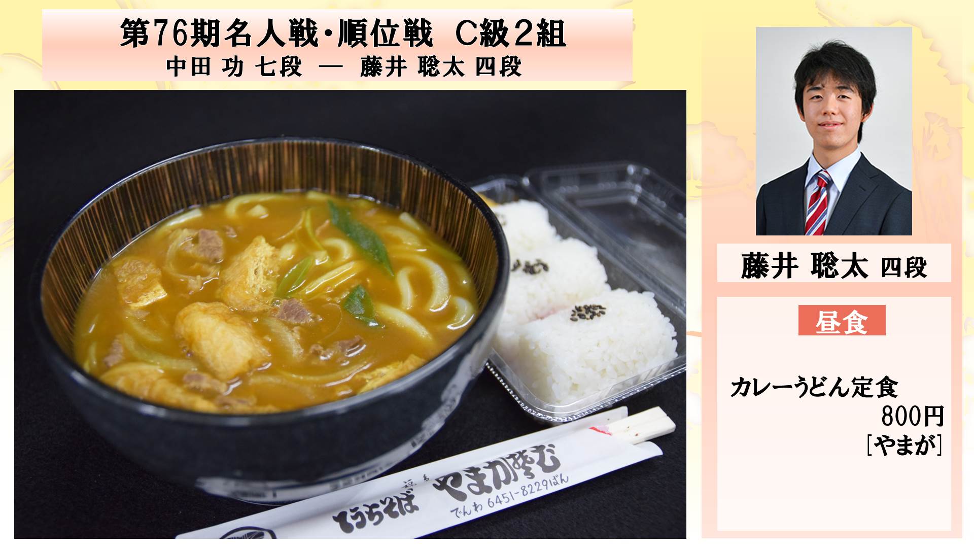 昼食休憩は正午から午後1時だが、早くも両者の昼食の出前注文が判明した。渡辺棋聖は木曜日限定でオーダーが可能な「内山田」の「スペシャルハンバーグセット」(2000円)。藤井七段は「やまがそば」の「味噌煮込みうどん」(850円)だった。