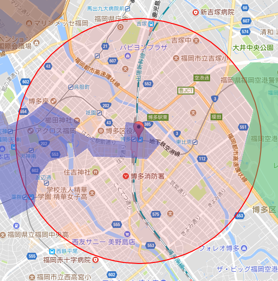 港は入らないけど博多駅から2,5km半径になります。ご査収ください