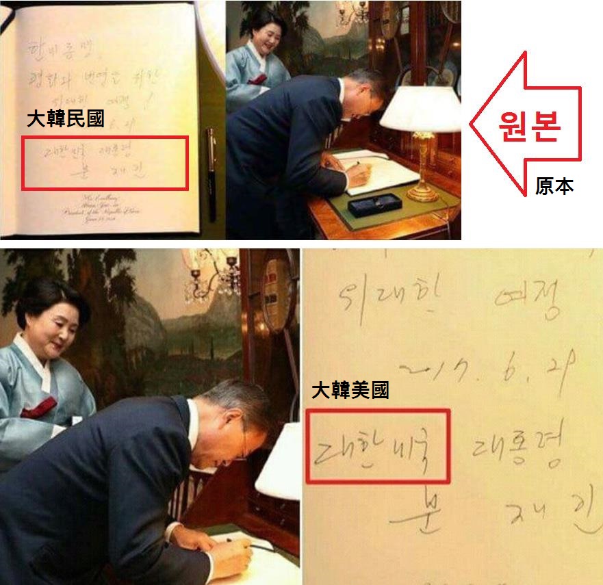 얼마 전, 文酋長님께서 米國에 방문했습니다. 그 때 방명록을 작성했습니다. 그런데 눈이 침침해서인지, 아니면 피곤해서인지 실수로 大韓民國을 大韓米國으로 적어버렸습니다.