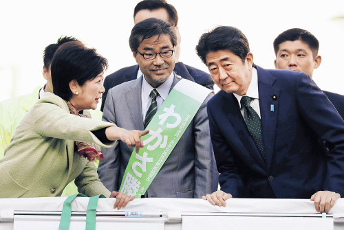 小池氏が抜けた後任選挙で自民党候補を小池知事と一緒に応援する安倍首相