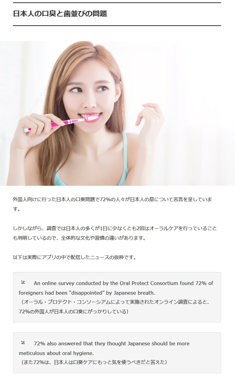 하지만 영미에서는 어릴적부터 치과의료에 대한 중요성을 느끼고 있기에 예방과 미적인 관심이 매우 높아 일본이 아직 따라가지 못하고 있는것이 현실입니다. 거기다 일본인은 치아에 돈을 들이기보다는 패션이나 자동차,취미 같은 자기투자를 하는 경향이 있는 것 같습니다. 이것도 치아에 대한 의식을 저하시키는 원인의 하나. 옷이나 소지품에 대한 의식은 높지만 평생 같이하는 치아는 문제가 생기고 나서야 치과에 가는 사람이 대부분입니다. 이러한 일본인의 치아 의식에 대해 해외 사람들은 어떻게 생각하고 있을까요? 예를 들어 일본에서는 귀엽다고 매력포인트가 되는 덧니도 영미에서는 드라큐라를 연상시킨다며 별로 좋은 이미지가 아니라고 합니다. 또한 캐나다 밴쿠버에 있었을 때 이런 이야기를 들은적이 있습니다.「중국인, 한국인, 일본인의 구별이 가지 않을 때 치아를 보면 금방 알수 있어. 치열이 안좋으면 일본인이야」라고 그런 의견을 듣다가 일본에 돌아왔더니 확실히 일본인의 치열의 고르지 못함, 치아의 불결함이 눈에 띄는 것을 실감 했습니다.