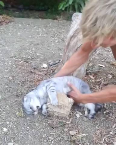 たぶんなぜか猫が石にしがみついて離れないのを