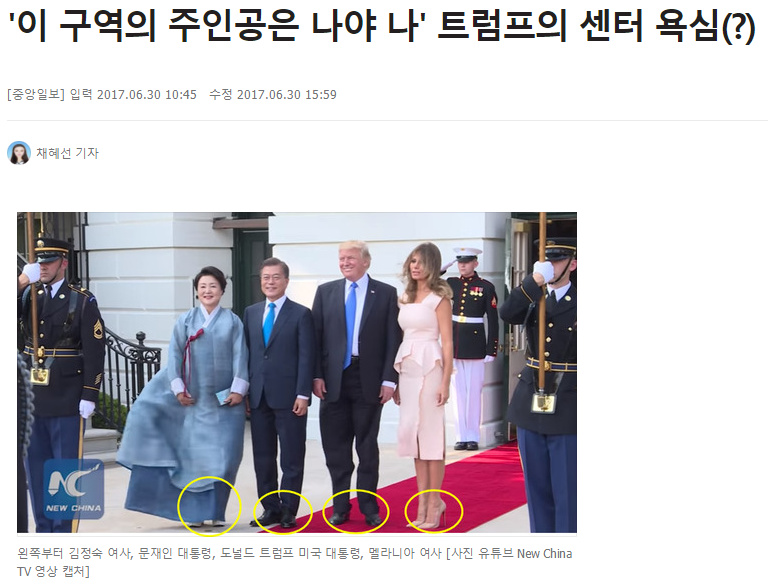 しかしレッドカーペットを踏んでいるのはドナルド・トランプ夫婦で、文在寅夫人はレッドカーペットを踏めていないことから、韓国メディアは「この場の主役は誰なんだ」と指摘。