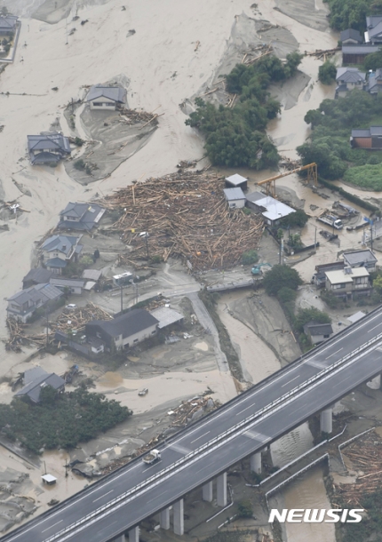 6일 상공에서 촬영한 일본 후쿠오카(福岡)현 아사쿠라(朝倉)시의 모습. 전날부터 쏟아진 폭우로 마을 전체가 물에 잠겨 있다. 2017.07.06.