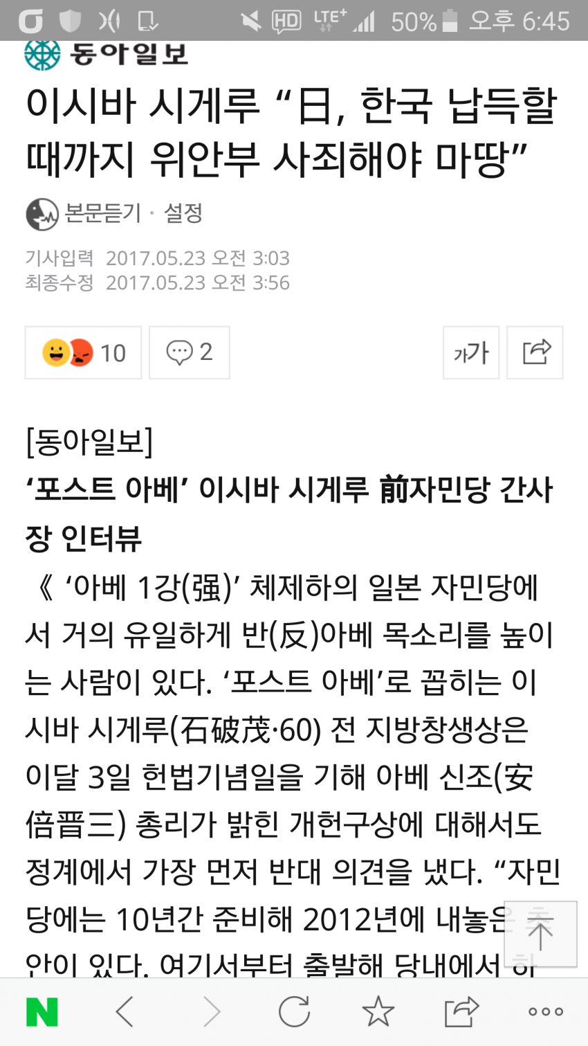 이시바 시게루 전 자민당 간사장 " 일본은 한국이 납득할땝가지 사죄 해야 "