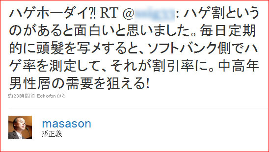ハゲホーダイ⁈ RT @ssig33: ハゲ割というのがあると面白いと思いました。毎日定期的に頭髪を写メすると、ソフトバンク側でハゲ率を測定して、それが割引率に。中高年男性層の需要を狙える!