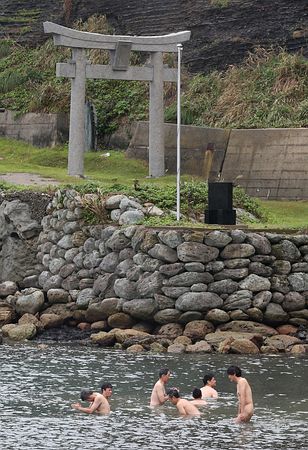 沖ノ島に到着し、海でみそぎをする報道関係者ら。島全体が神域で女人禁制とされ、男性もみそぎをしなければ上陸できない>>2