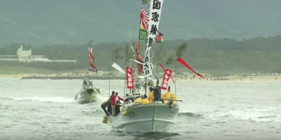 日本政府関係者によると、海上で行われる宗像大社の祭りの写真に大漁旗が写り込んでいたという。