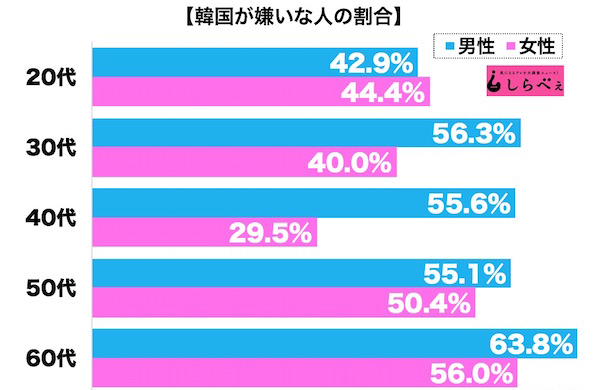 でもぶっちゃけ…そこまで韓国人は好かれていないよ。日本人は誰かを嫌うというマイナス要因を持つ事を避ける傾向にある。だから40%あればのこりの40%はどちらでもいいになる。30%だとすれば50%近くはどうでもいい判断じゃないかな。20%は盲目的韓国好きと歴史に疎い人と在日。