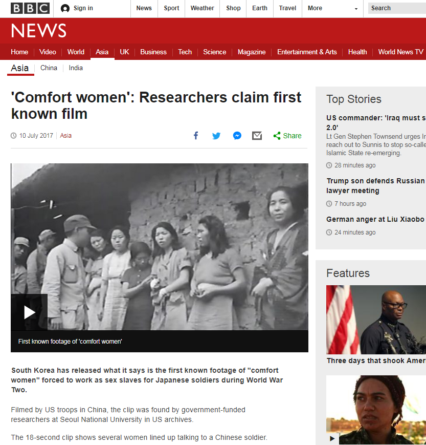 21名無し2017/07/11(Tue) 11:52:35ID:c2ODkwNzE(2/9)NG報告世界に報道されている慰安婦の真実をもっと日本人は学習しましょう。BBCニュース'Comfort women': Researchers claim first known filmhttp://www.bbc.com/news/world-asia-40552812>>24>>261