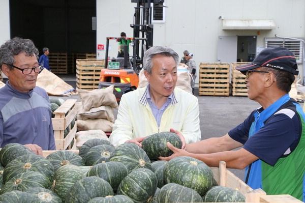 품질 좋기로 소문난 하동산 단호박이 일본으로 수출된다. 윤상기(가운데) 하동군수 등이 단호박 선별작업을 둘러보고 있다. 하동군 제공일본도 이제 안전한 한국의 식품을 찾기 시작하는구나.