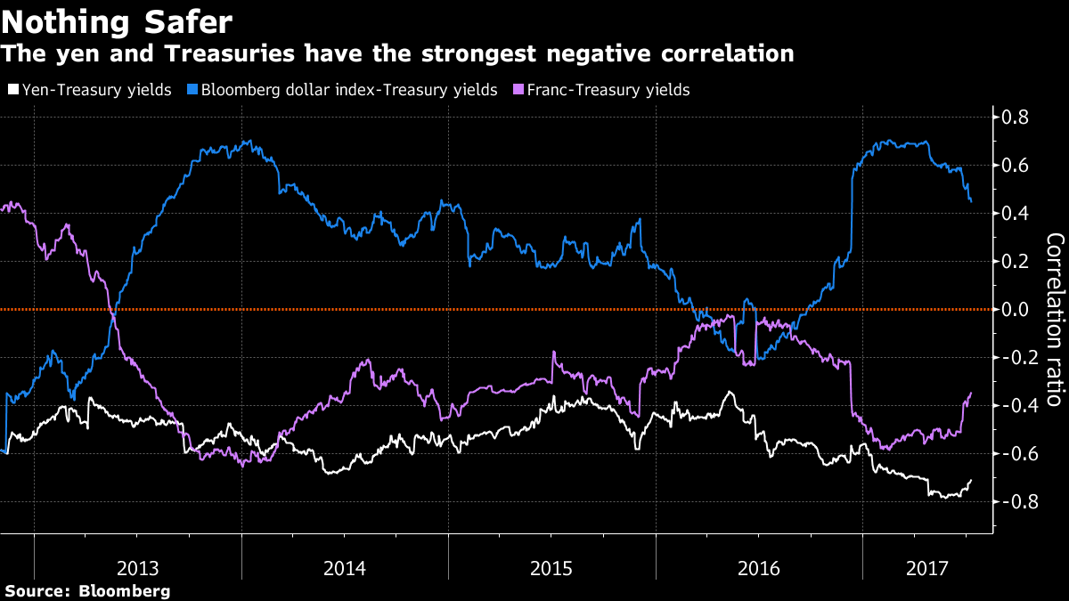 2007年から11年、12年から16年という2つの期間(各5年)を対象に先進国および新興市場の28のグローバル変動通貨について、毎日および毎月の動きを比較したところ、グローバル株式と米原油価格、米国の10年国債利回りとの負の相関関係を最もしっかり示したのは、円だった。