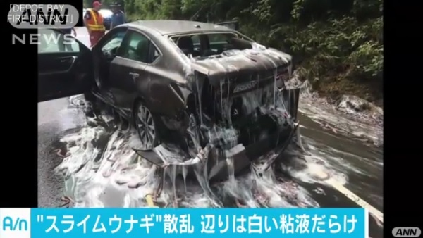 アメリカでトラックが横転し、大量のウナギが道路に散乱しました。