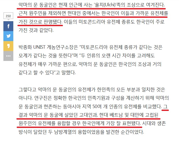 研究陣は、正確な韓国人の民族起源と構成を計算するために、悪魔の門洞窟人と現存する東アジア地域の50余りの人種の遺伝体を比較した。その結果、悪魔の門洞窟に住んでいた古代人と、現代のベトナムおよび台湾に孤立された先住民の遺伝体を融合する場合、韓国人に最もよく表現された。時代と生存方式が異なっていた二つの南方系列の融合だったことを発見した瞬間だった。
