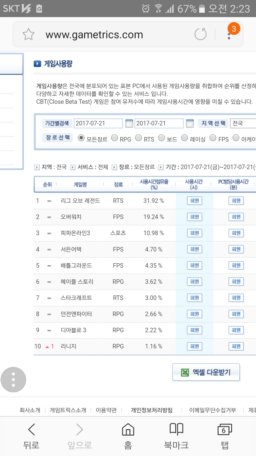 1名無し2017/07/22(Sat) 22:58:41ID:Y3NDA2NTQ(1/3)NG報告日本の子供に人気のゲームはcall of dutyシリーズです02상록2017/07/23(Sun) 01:59:34ID:Y5MTQzMTA(1/2)NG報告이건 작년 자료지만, 크게 달라진건 없는듯오버워치-리그 오브 레전드-서든어택-피파온라인 순서>>313名無し2017/07/23(Sun) 02:06:04ID:kzODU0NjE(2/3)NG報告>>2オーバーウォッチはすぐ飽きる>>404상록2017/07/23(Sun) 02:25:27ID:Y5MTQzMTA(2/2)NG報告>>3이번달의 순위 나왔었음.리그 오브 레전드-오버워치-피파온라인-서든어택-배틀그라운드 순게임은 잘 안하지만 리그 오브 레전드는 5년넘게 순위권>>515名無し2017/07/23(Sun) 02:55:35ID:kzODU0NjE(3/3)NG報告>>4バトルグラウンド韓国のゲームなのに思ったより順位低いな>>616名無し2017/07/23(Sun) 11:19:07ID:Q2NzIxMzY(1/1)NG報告>>5유료게임이라는걸 감안하면 높은편입니다07名無し2017/07/23(Sun) 12:45:48ID:QwNzkyNzM(1/1)NG報告獲得した話だが、今進行中のオーバーウォッチワールドカップが韓国人たちに多くの関心を集めています。そして数日前、日本のaktm選手がスペインを相手にmcreeにスーパープレーを披露し、国内のコミュニティでちょっと話題になったんですYouTubehttps://youtu.be/1cp-PhZPeHk?t=100