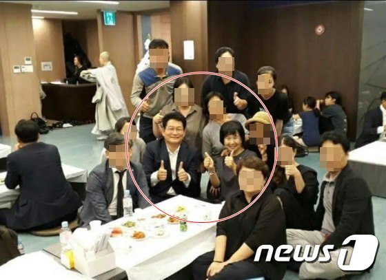 問題の写真は25日、韓国のネット掲示板やSNSで公開され広まった。写真のセンターに写るのは、金さんの葬儀場を訪れた与党・共に民主党の宋永吉(ソン・ヨンギル)・孫惠園(ソン・ヘウォン)両議員。2人とも両手の親指を「グー」という感じで立てて満面の笑み、周りに写る10人ほどの弔問客たちも親指を立てたりピースサインをしたり、公開された写真ではモザイク処理してあるものの、やはりカメラに笑顔を向けているようだ。