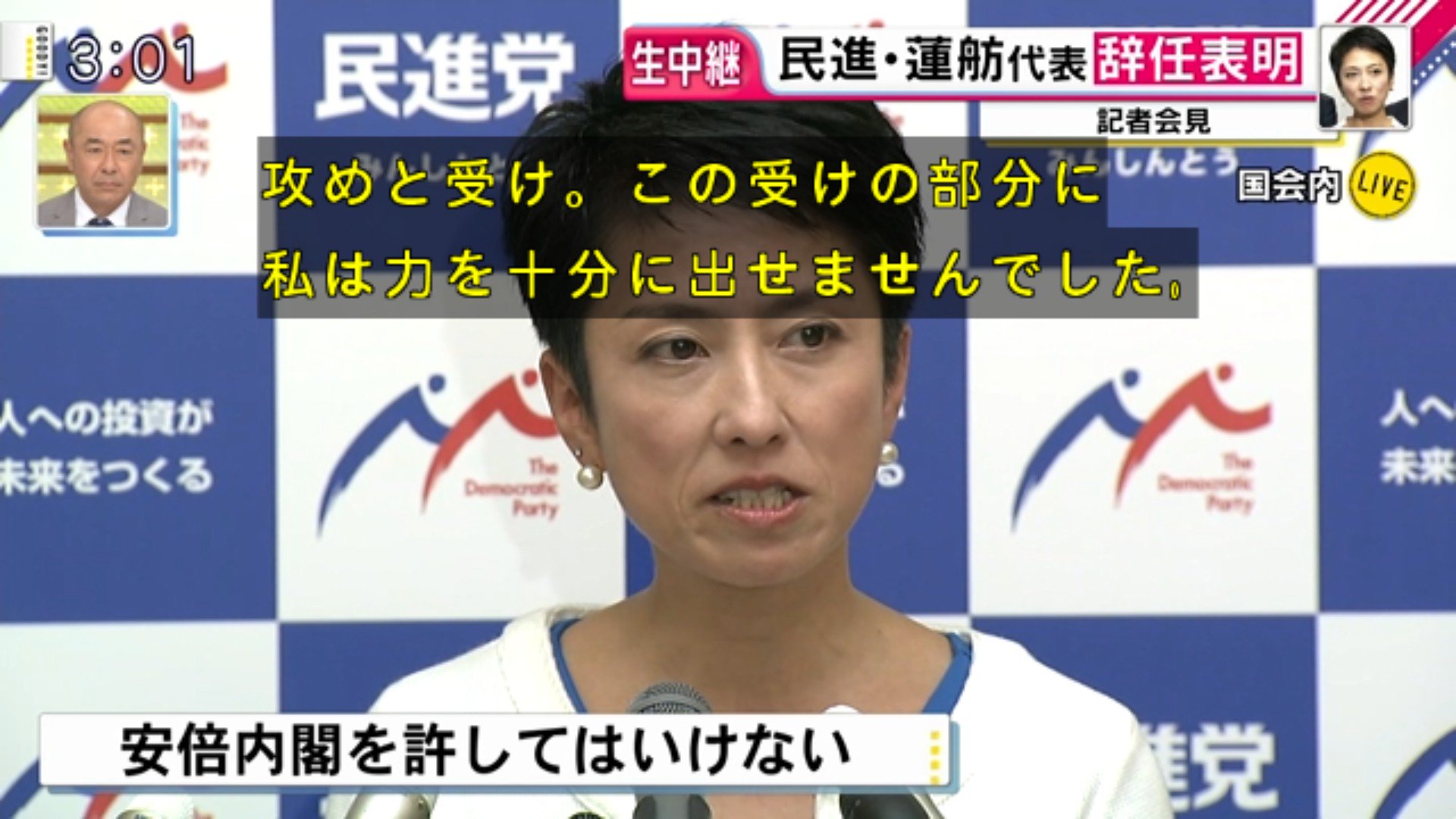 次の衆議院選挙で東京の小選挙区から立候補する考えを明らかにしていたことについて、蓮舫代表は「そのことも含めて一度、立ち止まる。立ち止まって考えたい」と述べました。あー、見た見た、1時間たっぷり見た、なんか終始イライラした。