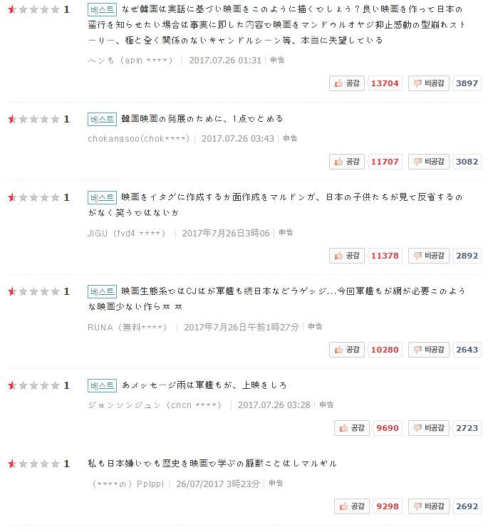 ごく少量の正常な奴だけ、反日史観を否定し、反日扇動愛国扇動左派万歳映画と批判してるって感じかね。こんな評価の低い、さすがの韓国人でもファンタジーって言うクソ映画