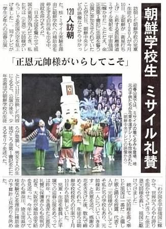 訪朝した朝鮮学校の児童・生徒ら約120人が今月10日、北朝鮮が「衛星打ち上げ」と称する長距離弾道ミサイル発射を「宇宙強国に輝かせた」とたたえ、金正恩(キム・ジョンウン)第1書記に忠誠を誓う公演に参加させられていたことが17日、朝鮮中央テレビの映像などから分かった。核・ミサイル実験を理由に朝鮮学校への補助金を停止する自治体も出る中、波紋を呼びそうだ。