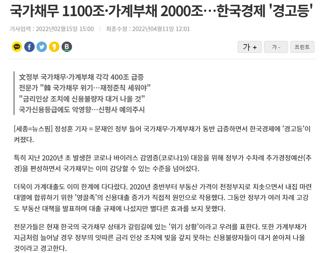 国家債務1100兆ウォン·家計負債2000兆ウォン···韓国経済「警告灯」
