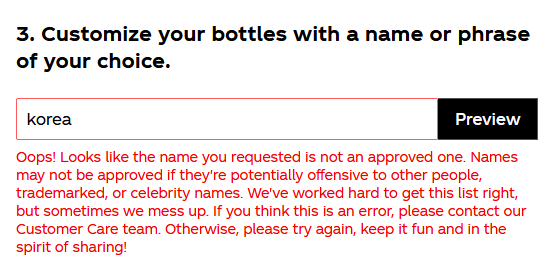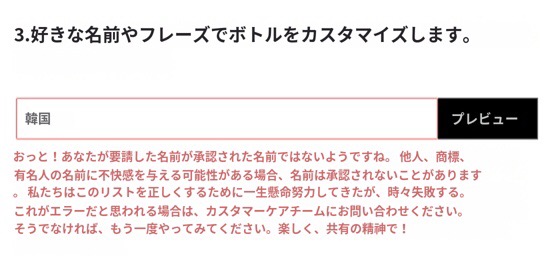米国コカコーラで本格的な夏の到来に向けて準備した「オーダーメード型コーラ瓶」マーケティング。「Japan(日本)」などを入力欄に入力するとプレビュー画面に該当の文字が入ったイメージ図が出てくる。しかし「Korea(韓国)」を入力すると注意書きが出てくる。>>37