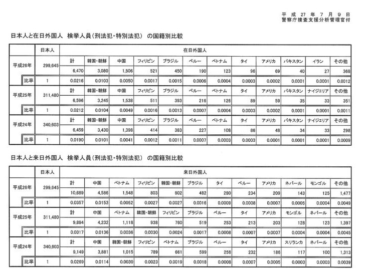 「平成27年7月9日警察庁捜査支援分析管理官付」の資料より거주자 數를 감안하라.