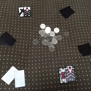 準備 株札 座布団 100円玉と500円玉(掛けたら違法ですヨ