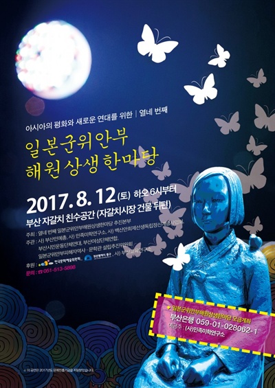 부산민예총, 민족미학연구소, 부산여성단체연합 등 단체로 구성된 '일본군위안부해원상생한마당 추진본부'는 오는 12일 오후 6시 자갈치 친수공간(자갈치시장 건물 뒤편)에서 "해원상생 한마당"을 연다.