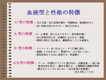 血液型での性格分別は、日本人がやり始めて、日本の影響の強い、朝鮮と、台湾位でしか、やってないと、読んだ事がある。
