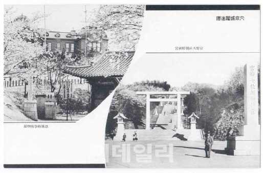 日本が京城に建設した「朝鮮神宮」とみすぼらしい朝鮮人駕籠かきの姿を写した絵葉書き。日帝はきらびやかな日本文化とみすぼらしい朝鮮人という構図を通じて朝鮮に弱者のイメージを投影した。
