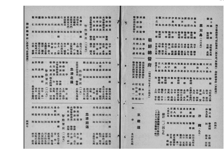 昭和3年7月現在の朝鮮総督府警察上層部の名簿。警察行政のトップである道知事や道警察本部刑事課長に朝鮮人