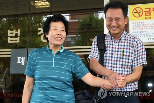 判決を受けて地裁前で笑顔を見せる原告の女性=8日、光州(聯合ニュース)미화하는