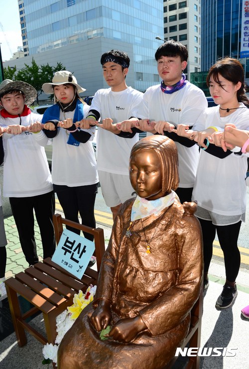 全国の少女像巡礼に乗り出した民族運動団体「興士団」のメンバーである若者15人が7日午前、釜山市東区の日本総領事館前にある少女像前で、巡礼出発を前に、少女像を守るという約束の意味で、互いの指をつないでいる。