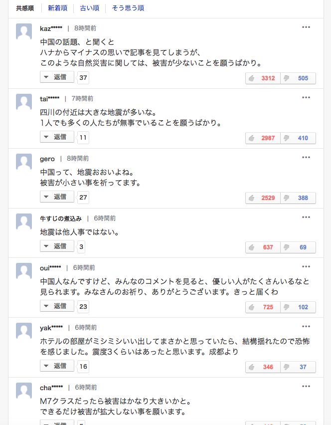 中国の 反応ブログの スレで 見たんだけど、 中国の 地震に対する 日本人の 善意のコメントに 心が温まるetc…だって。