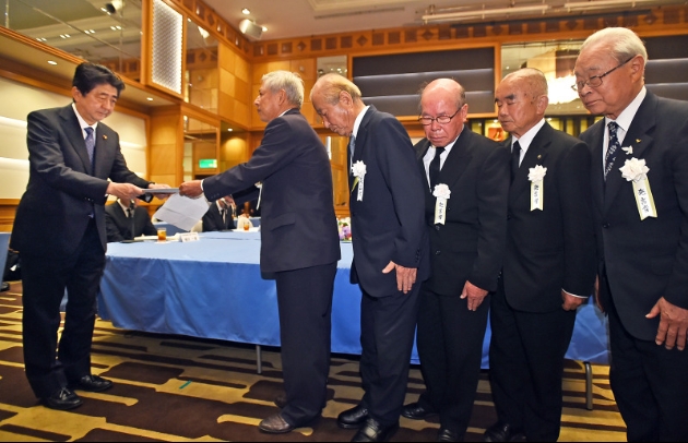 安倍晋三首相(左)に要望書を手渡す被爆者5団体の代表者