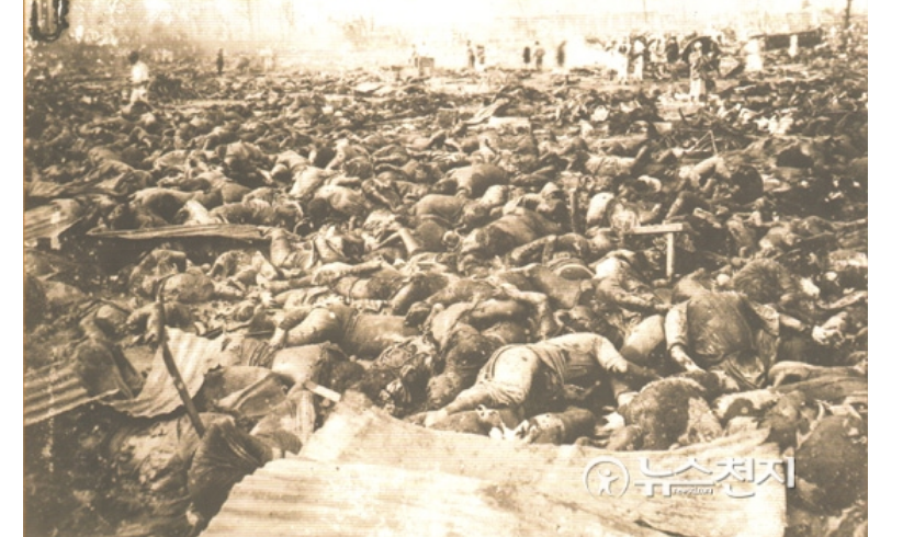 お前が示したリンク先のwebページの最初の写真は、関東大震災の日本橋付近における地震に伴う大火災の被害者の写真だ。早く朝鮮戦争が終戦して世界が平和になりますように!