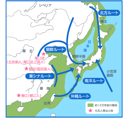 大陸から日本に陸地メインで来ようとすれば、朝鮮半島とかロシア、中国から日本海を渡って来るのが普通だろ?