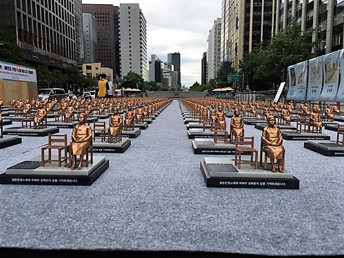 旧日本軍の慰安婦被害者支援団体「韓国挺身隊問題対策協議会」(挺対協)と「正義記憶財団」は5回目の「世界慰安婦の日」を迎えた14日、ソウル都心の清渓広場に慰安婦被害者を象徴する「少女像」のミニチュア500体を展示した。