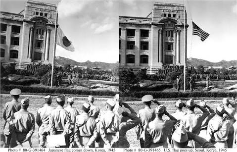 1945年9月9日の、統治国交代式典にて、降旗する日章旗と、掲揚される星条旗