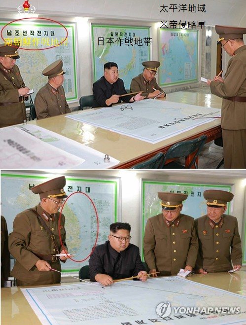 '일본 작전지대'라고 적힌 지도에는 일본 남쪽 태평양 해상까지 라인이 그어져 일본 전역이 북한 미사일 타격 범위에 있다는 것을 표시한 것으로 분석된다.韓国は、無条件降伏して民族統一。
