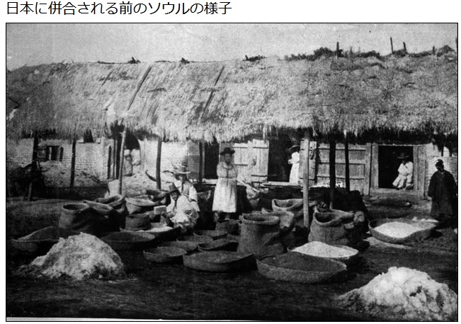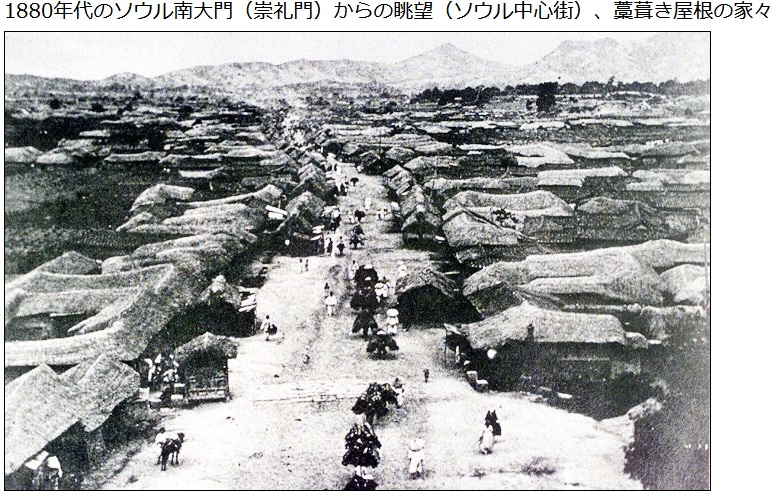 1894年に朝鮮を訪したイザベラ・バードが朝鮮紀行で書いたソウルの様子「幹線道路の周辺のはげ山は非常に目につき、儒教の影響で国内で見下されている手工業は不振で美術工芸は何もなく、国土の有様に関しても不幸な未来を抱かせると述べている。」「道は牛がすれ違えないほど細く迷路のようであり、家から出た汚物によって悪臭が酷くソウルこそこの世で一番不潔な町」「都会であり首都であるにしては、そのお粗末さは実に形容しがたい」「彼らの肌は浅黒くて、鼻は低く目は黒いが、そのモンゴル系的な容貌」「彼らの肌は浅黒くて、鼻は低く目は黒いが、そのモンゴル系的な容貌」