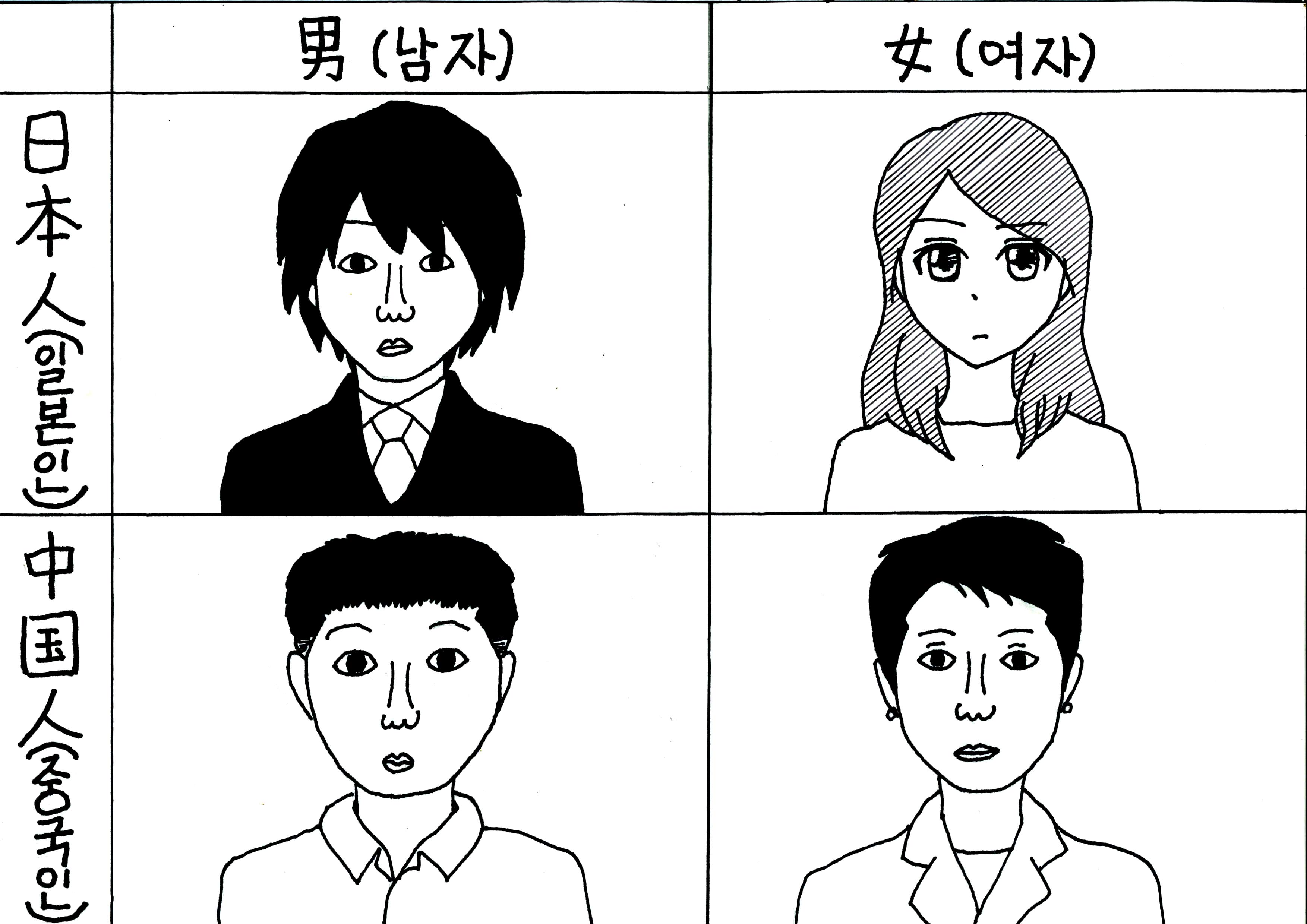 ただし、それだけじゃつまらないので、俺が考える中国人・フィリピン人・タイ人のイメージも描いてみた。まずは日本人・中国人のイメージからだ。