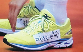 韓国人女子バレー選手、日本製のシューズのロゴの上に「大韓独立」と書かれたテープを貼って出場