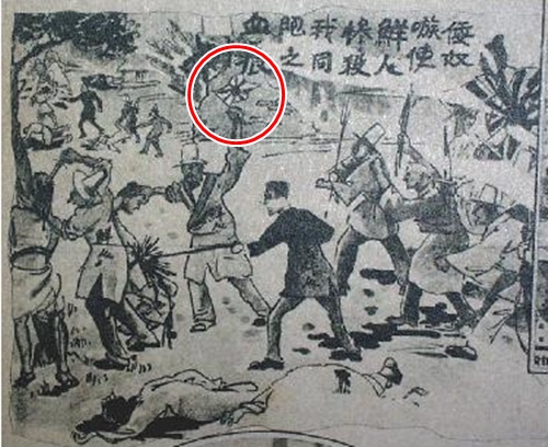 일본군의 깃발을 휘두르며 중국인을 공격하는 조선인