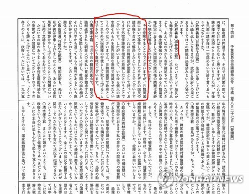 '개인청구권 인정' 日 정부 답변 담은 참의원 회의록(도쿄=연합뉴스) 최이락 특파원 = 1991년 8월 27일 일본 참의원 예산위원회에서 야나이 순지(柳井俊二) 당시 외무성 조약국장이 '청구권협정은 한일 양국이 국가가 가지는 외교보호권을 서로 포기한 것이지 개인 청구권 자체를 국내법적 의미로 소멸시킨 것이 아니다'라고 답한 내용이 담긴 참의원 회의록. 2017.8.20