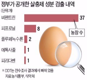 政府は18日発表した全数調査結果でDDT検出の事実を除いた。しかし、逆に適合判定を下して卵の市場での流通を許可した。 農産物品質管理院の関係者は「DDT検出量が残留許容基準値(0.1㎎/キロ)以内に出て安全性に問題がないと見て適合判定をした」と話した。